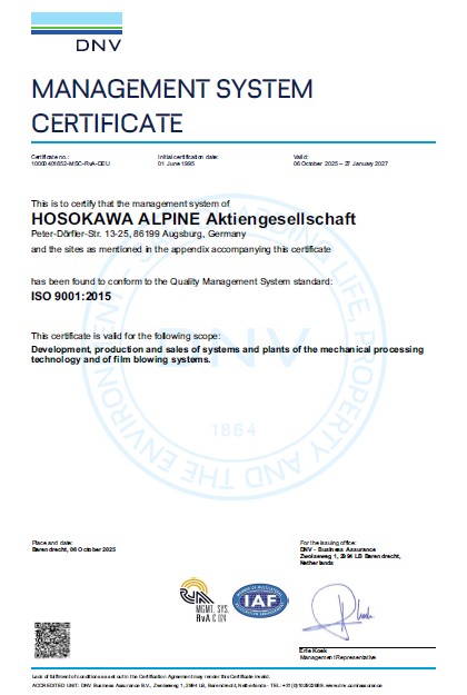 Hosokawa Alpine est certifié selon la norme ISO 9001:2015. Nos machines et installations sont conformes aux directives ATEX en vigueur. Vous trouverez nos certificats IECEx actuels pour la protection contre les explosions sur www.iecex-certs.com